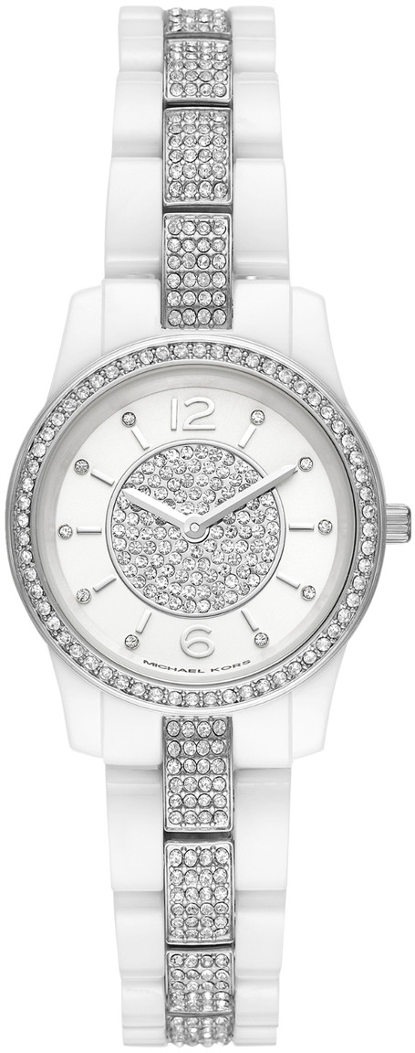 Michael Kors Runway MK6621 on rannekello, jollaisesta olet aina haaveillut. Siron naisellinen, pienikokoinen mutta silti erittäin näyttävä kokonaisuus, joka erottuu edukseen tilanteessa kuin tilanteessa. Kauniisti välkehtivät Swarovski-kristallit kellon pinnalla saavat takuulla pääsi pyörälle! Tässä valkoisessa, keraamisessa mallissa on 28 mm leveä runko ja 14 mm ranneke.