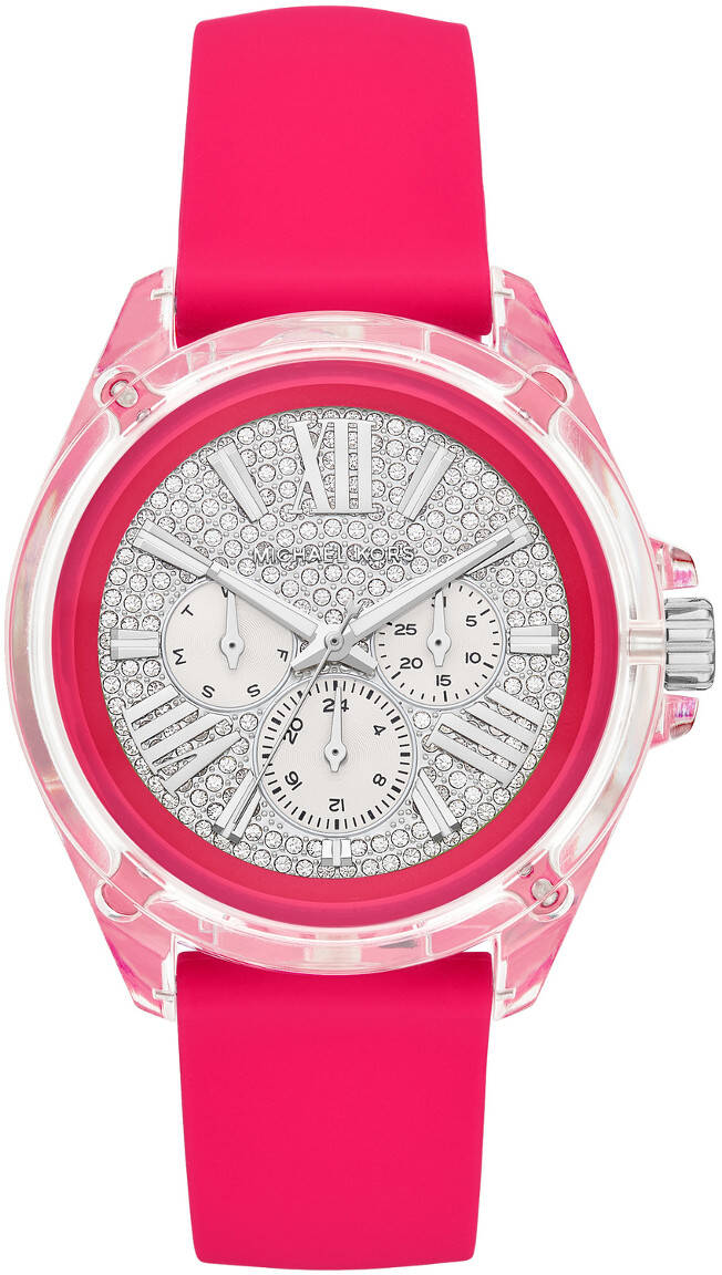 Pue Michael Kors Wren MK6677 ranteeseesi ja muoti kulkee mukanasi kaikkialle! Räväkän pinkki ulkoasu saa kruununsa kellotaulusta, joka on päällystetty kirkkain zirkonioin ja jota kiertävät pimeässä luminoituvat viisarit ja indeksit. 42 mm leveän rungon tausta on ruostumatonta terästä ja 20 mm ranneke pehmeää silikonia. Kellotaulusta löydät päivämäärän ja viikonpäivän osoittimet sekä 24 h näytön.