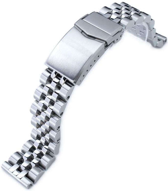 MiLTAT Angus Jubilee 22mm Straight End teräsranneke SS221820B059S. Ranneke on valmistettu 316L ruostumattomasta teräksestä ja se sopii näppärästi kaikkiin tavallisimpiin 22 mm lugivälin omaaviin kelloihin. Rannekkeen palat ovat ruuvikiinnitteiset ja vahvasti pyöristetyt. Mukana toimitetaan 2 kpl 1,78 mm jousinastoja, jotka takaavat turvallisen kiinnityksen kellon runkoon. Rannekkeen leveys päädyistä on 22 mm ja lukon kohdasta 18 mm. Jämäkän lukituksen takaa kaksoislukittuva linkkulukko. MiLTAT-rannekkeille myönnetään vuoden takuu.