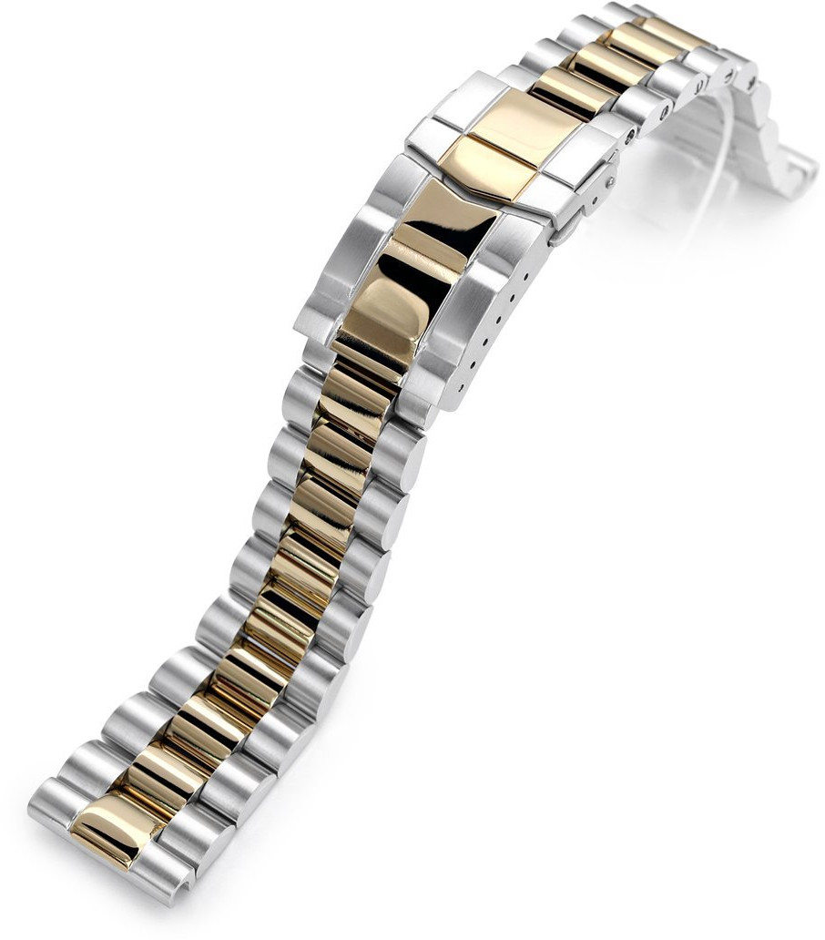 MiLTAT Endmill Two Tone 22mm Straight End teräsranneke SS221805P2G033S. Tämä kaksivärinen ranneke on valmistettu 316L ruostumattomasta teräksestä ja se sopii näppärästi kaikkiin tavallisimpiin 22 mm lugivälin omaaviin kelloihin. Rannekkeen palat ovat ruuvikiinnitteiset ja vahvasti pyöristetyt. Mukana toimitetaan 2 kpl 2,5 mm jousinastoja, jotka takaavat turvallisen kiinnityksen kellon runkoon. Rannekkeen leveys päädyistä on 22 mm ja lukon kohdasta 18 mm. Jämäkän lukituksen takaa kaksoislukittuva linkkulukko. MiLTAT-rannekkeille myönnetään vuoden takuu.