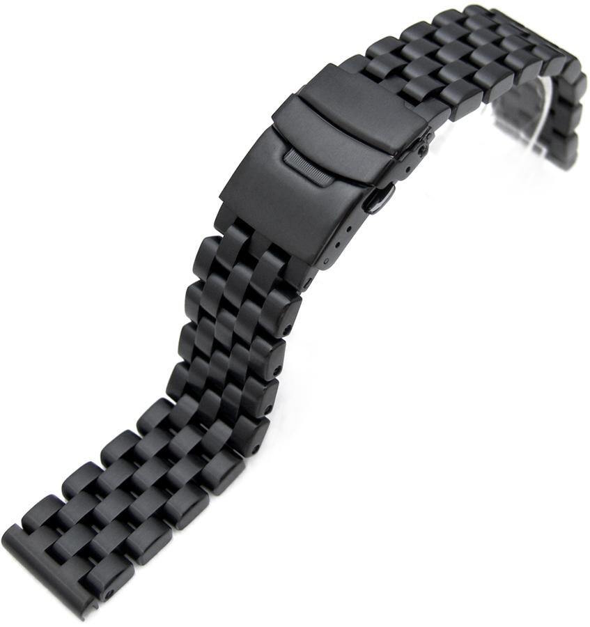 MiLTAT PVD Black Super Engineer 22mm Straight End teräsranneke SS222203BBK009. Tämä mustaksi värjätty ranneke on valmistettu 316L ruostumattomasta teräksestä ja se sopii näppärästi kaikkiin tavallisimpiin 22 mm lugivälin omaaviin kelloihin. Rannekkeen palat ovat ruuvikiinnitteiset ja vahvasti pyöristetyt. Mukana toimitetaan 2 kpl 2,5 mm jousinastoja, jotka takaavat turvallisen kiinnityksen kellon runkoon. Rannekkeen leveys päädyistä on 22 mm ja lukon kohdasta 23,5 mm. Jämäkän lukituksen takaa kaksoislukittuva linkkulukko. MiLTAT-rannekkeille myönnetään vuoden takuu.