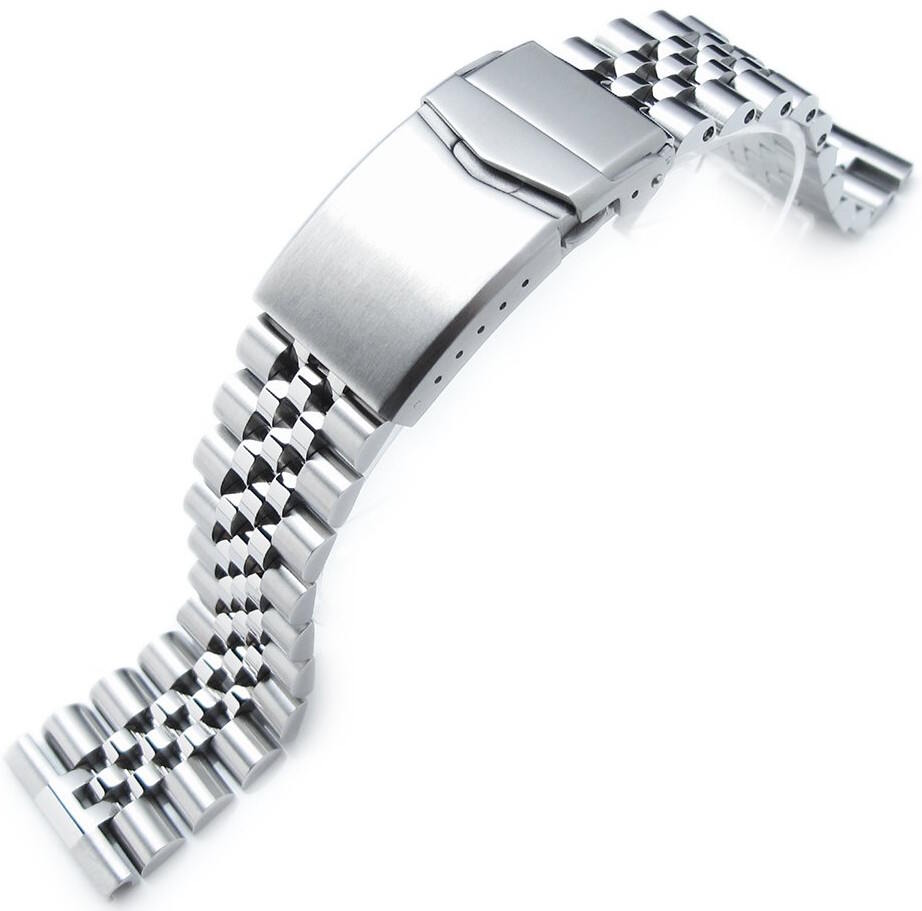 MiLTAT Super Jubilee 22mm Straight End teräsranneke SS221820B020S. Ranneke on valmistettu 316L ruostumattomasta teräksestä ja se sopii näppärästi kaikkiin tavallisimpiin 22 mm lugivälin omaaviin kelloihin. Rannekkeen palat ovat ruuvikiinnitteiset ja vahvasti pyöristetyt. Mukana toimitetaan 2 kpl 2,5 mm jousinastoja, jotka takaavat turvallisen kiinnityksen kellon runkoon. Rannekkeen leveys päädyistä on 22 mm ja lukon kohdasta 18 mm. Jämäkän lukituksen takaa kaksoislukittuva linkkulukko. MiLTAT-rannekkeille myönnetään vuoden takuu.