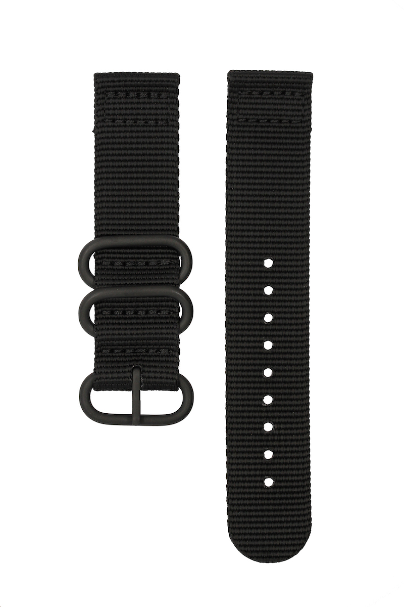 Mustassa 22 mm nylonista valmistetussa rannekkeessa on mustat, mattapistaiset teräslenkit ja solki, ja rannekkeen kiinnityskohdan leveys on 22 mm. Ranneke sopii kaikkiin kelloihin, joissa rannekkeen kiinnityskohdan leveys on 22 mm.  Mukana ei ole juosinastoja.