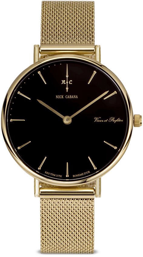 Nick Cabana Boheme D'or NC314 -rannekello on elegantti ja kaunis. Kellon runko ja ranneke ovat valmistettu kullan väriseksi pinnoitetusta ruostumattomasta teräksestä. Kellon rungon leveys on 36.4mm ja paksuus 6.2mm. Rannekkeen leveys kiinnityskohdassa on 18mm. Nick Cabana -kelloille myönnetään 2 vuoden takuu ja ne toimitetaan valmistajan alkuperäisessä pakkauksessa. Voimme kaivertaa veloituksetta kellon takakanteen esimerkiksi nimikirjaimet ja päivämäärän (maksimissaan 15 merkkiä). Valitse ensin kaiverrus ja kaiverruksessa käytettävä tekstityyli ja kirjoita kaiverrettavat tiedot "kaiverrettava teksti" -kenttään. Huom! Kaiverretuilla tuotteilla ei ole palautusoikeutta!