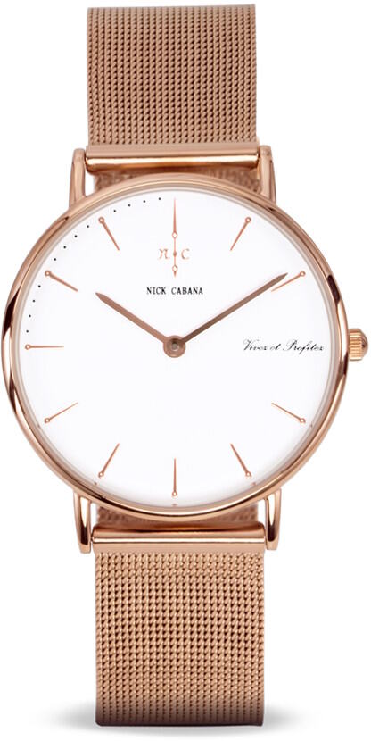Nick Cabana Boheme Gold Fox Mesh 36 NC010 kellossa on hieno punakullan värinen mesh -ranneke. Koneistona toimii laadukas Japanilainen Citizen Miyota 1L22 quartz. Runko on kiiltävä ja punakullanvärinen. Sen leveys on 36mm ja paksuus vain 6mm. Kellotaulu on väriltään valkoinen. Rannekkeen kiinnityskohdan leveys 14mm. Nick Cabana kelloille myönnetään 2 vuoden takuu ja ne toimitetaan valmistajan alkuperäisessä rasiassa.