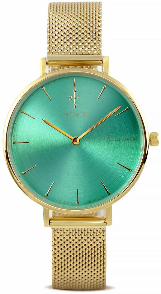 Nick Cabana Boheme Mint 36mm 317 -kellossa on näyttävä vihreä kellotaulu ja kullanvärinen mesh-ranneke. Kellon rungon leveys on 36mm ja paksuus 6mm. Rannekkeen leveys kiinnityskohdassa on 18mm. Nick Cabana -kelloille myönnetään 2 vuoden takuu ja ne toimitetaan valmistajan alkuperäisessä pakkauksessa.