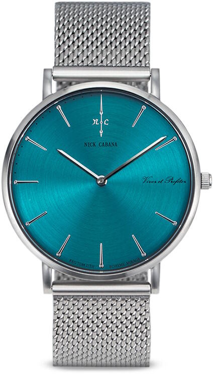 Nick Cabana Boheme Mirage NC302 -rannekello on elegantti ja kaunis. Kellon runko ja ranneke ovat valmistettu hopean värisestä ruostumattomasta teräksestä. Kauneuden kruunaa mineraalilasilla suojattu petroolinvihreä kellotaulu. Kellon rungon leveys on 40.4mm ja paksuus 6.8mm. Rannekkeen leveys kiinnityskohdassa on 20mm. Nick Cabana -kelloille myönnetään 2 vuoden takuu ja ne toimitetaan valmistajan alkuperäisessä pakkauksessa. Voimme kaivertaa kellon takakanteen esimerkiksi nimikirjaimet ja päivämäärän (maksimissaan 15 merkkiä). Valitse ensin kaiverrus ja kaiverruksessa käytettävä tekstityyli ja kirjoita kaiverrettavat tiedot "kaiverrettava teksti" -kenttään. Huom! Kaiverretuilla tuotteilla ei ole palautusoikeutta!