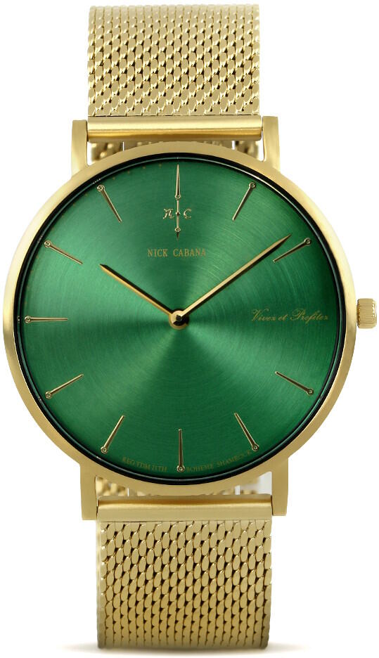 Nick Cabana Boheme Shamrock 40mm 304 -kellossa on näyttävä vihreä kellotaulu ja kullanvärinen mesh-ranneke. Kellon rungon leveys on 40mm ja paksuus 6mm. Rannekkeen leveys kiinnityskohdassa on 20mm. Nick Cabana -kelloille myönnetään 2 vuoden takuu ja ne toimitetaan valmistajan alkuperäisessä pakkauksessa.