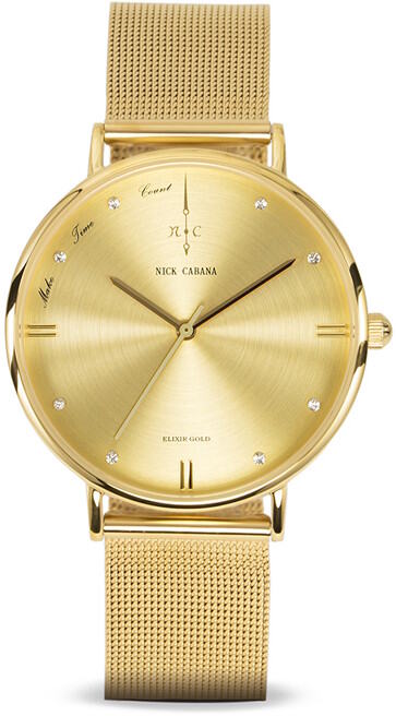 Nick Cabana Elixir Petite Gold 132 on sirompi koko suositusta Petite Gold mallista. Koneistona kellossa on laadukas japanilainen Miyota paristokoneisto. Rungon leveys on 30mm ja paksuus vain 6mm. Mesh-rannekkeen kiinnityskohdan leveys on 14mm. Nick Cabana kelloille myönnetään 2 vuoden takuu ja ne toimitetaan valmistajan alkuperäisessä rasiassa.