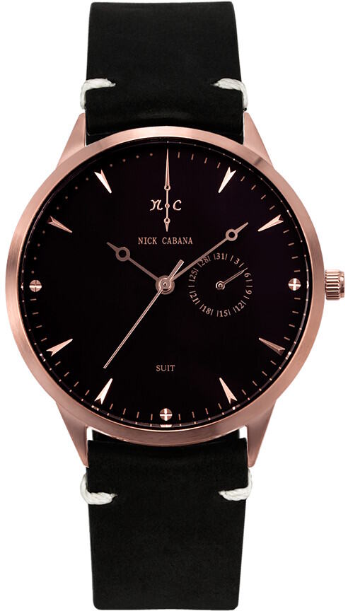Nick Cabana Nilaya Suit 201 pukukellossa kellossa on musta italialainen-nubuck nahkaranneke. Koneistona on laadukas Sveitsiläinen Ronda 762 quartz koneisto. Runko on harjatun punakullanvärinen ja sen leveys on 40mm ja paksuus vain 6mm. Kellotaulu on mustan värinen. Rannekkeen kiinnityskohdan leveys 20mm. Nick Cabana kelloille myönnetään 2 vuoden takuu ja ne toimitetaan valmistajan alkuperäisessä rasiassa.
