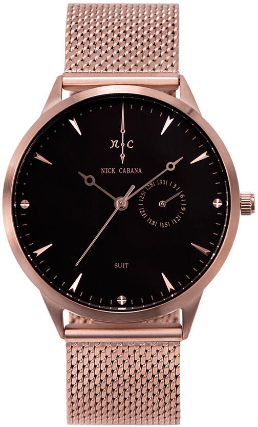 Nick Cabana Nilaya Suit Mesh NC208 -kellossa on punakullanvärinen runko ja ranneke sekä musta kellotaulu. Koneistona on laadukas Japanilainen Citizen Miyota quartz koneisto. Runko on punakullanvärinen ja sen leveys on 40mm ja paksuus vain 6mm. Rannekkeen kiinnityskohdan leveys 20mm. Nick Cabana kelloille myönnetään 2 vuoden takuu ja ne toimitetaan valmistajan alkuperäisessä rasiassa.