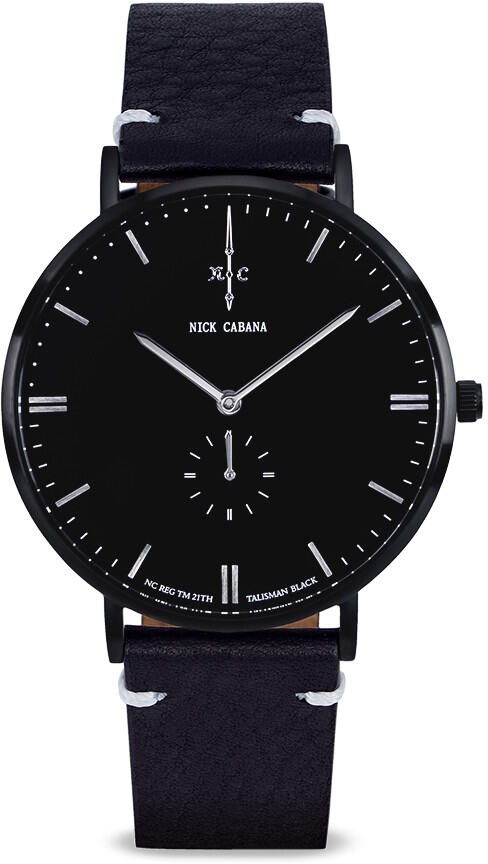 Nick Cabana Talisman Black 102 kellossa on musta italialainen nahkaranneke, jossa on valkoinen tikkaus. Koneistona on laadukas japanilainen Miyota 1L45 quartz koneisto. Rungon väri on harjattu musta ja sen leveys on 41mm ja paksuus vain 8mm. Kellotaulu on mustan värinen. Rannekkeen kiinnityskohdan leveys 20mm. Nick Cabana kelloille myönnetään 2 vuoden takuu ja ne toimitetaan valmistajan alkuperäisessä rasiassa.
