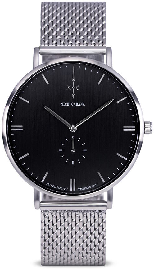 Nick Cabana Talisman NO 7 kellossa on musta kellotaulu ja muodikas mesh-ranneke. Koneistona on laadukas Sveitsiläinen Rondan paristokoneisto. Rungon leveys on 42mm ja paksuus vain 8mm. Rannekkeen kiinnityskohdan leveys 20mm. Nick Cabana kelloille myönnetään 2 vuoden takuu ja ne toimitetaan valmistajan alkuperäisessä rasiassa.