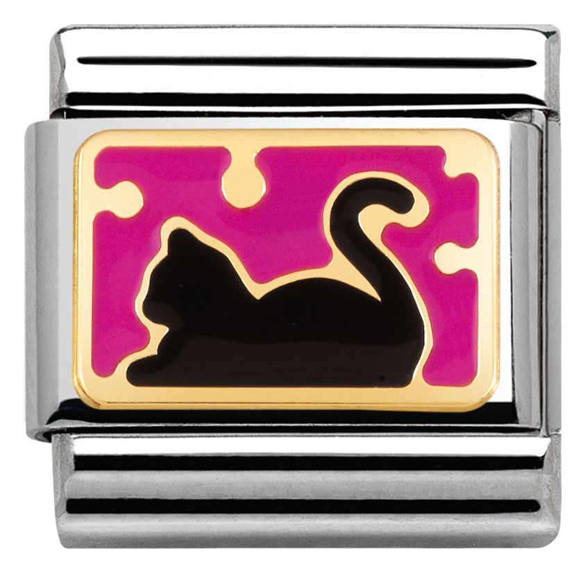 Nomination 030284-08 musta kissa -pala pinkillä taustalla on valmistettu laadukkaasta ruostumattomasta teräksestä, 18k kullasta ja emalista. Nomination paloille myönnetään kahden vuoden takuu.