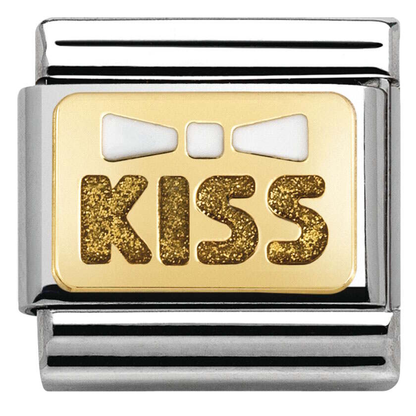 Nomination classic 030280-35 White bow with gold kiss. Nomination palat ovat valmistettu laadukkaasta ruostumattomasta teräksestä ja 18k kullasta. Rusetti on valkoista emalia ja kiss teksti on kirjailtu kultaisella glitterillä. Nomination paloille myönnetään kahden vuoden takuu!