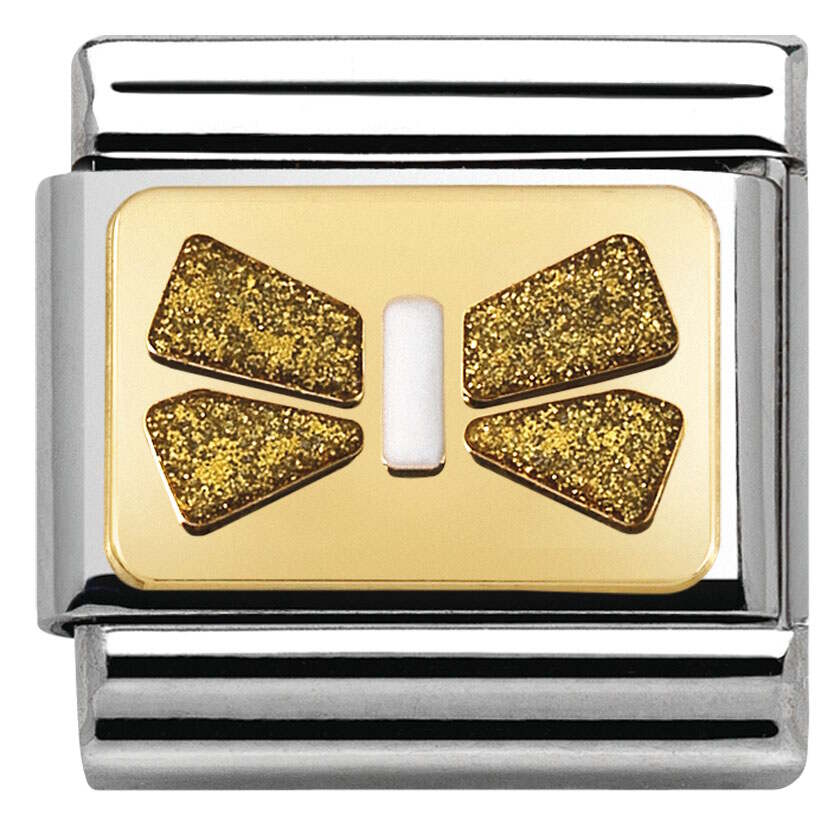 Nomination classic 030280-42 Gold bow. Nomination palat ovat valmistettu laadukkaasta ruostumattomasta teräksestä ja 18k kullasta. Rusetti on kultaista glitteriä ja rusetin keskustaaa koristaa valkoinen emali. Nomination paloille myönnetään kahden vuoden takuu!