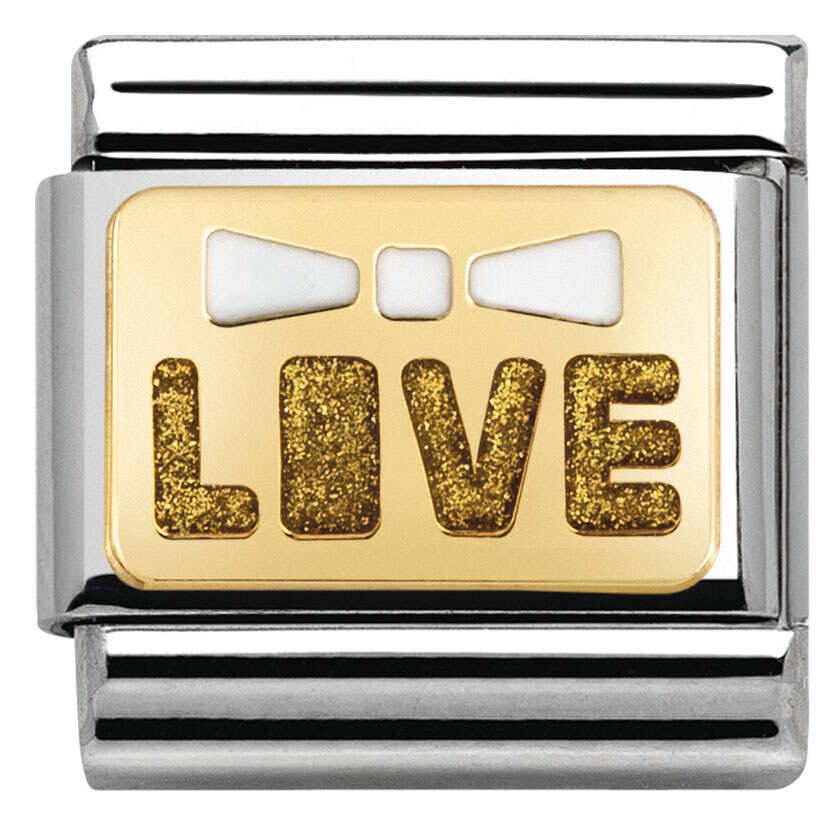 Nomination classic 030280-47 White bow with love. Nomination palat ovat valmistettu laadukkaasta ruostumattomasta teräksestä ja 18k kullasta. Rusetti on valkoista emalia ja live teksti on kirjailtu kultaisella glitterillä. Nomination paloille myönnetään kahden vuoden takuu!