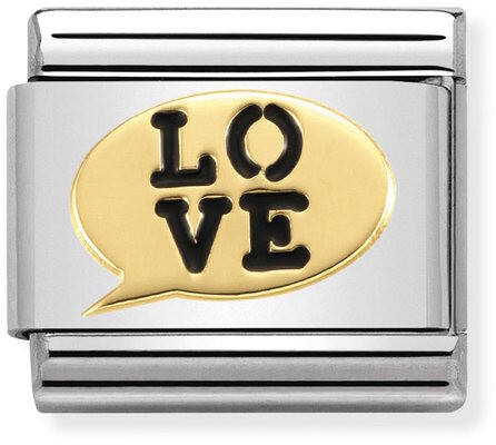 Nomination classic 030283-18 Love. Nomination palat ovat valmistettu laadukkaasta ruostumattomasta teräksestä ja 18k kullasta. Love-teksti on mustaa emalia. Nomination paloille myönnetään kahden vuoden takuu!