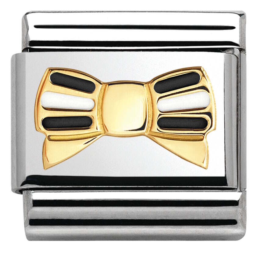 Nomination classic 030285-46 Bow with white and black stripes. Nomination palat ovat valmistettu laadukkaasta ruostumattomasta teräksestä ja 18k kullasta. Palan raidat ovat valkoista sekä mustaa emalia. Nomination paloille myönnetään kahden vuoden takuu!