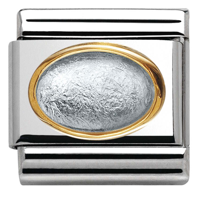 Nomination classic 030516-01 Rock Crystal with Silver Leaf. Nomination palat ovat valmistettu laadukkaasta ruostumattomasta teräksestä ja 18k kullasta. Palaa koristaa kaunis vuorikristalli, jonka alla on lehtihopeaa. Nomination paloille myönnetään kahden vuoden takuu!