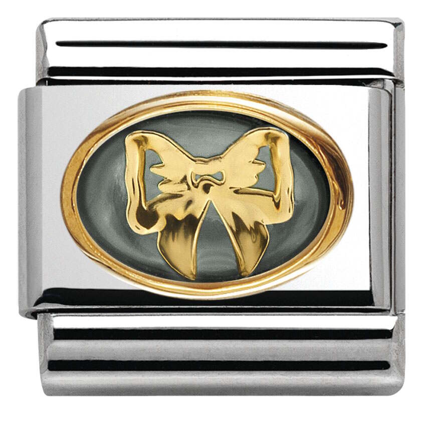 Nomination classic 030517-02 Bow and grey. Nomination palat ovat valmistettu laadukkaasta ruostumattomasta teräksestä ja 18k kullasta. Palaa koristaa Harmaan helmiäinen vuorikristalli, jonka sisällä kaunis kultainen rusetti. Nomination paloille myönnetään kahden vuoden takuu!