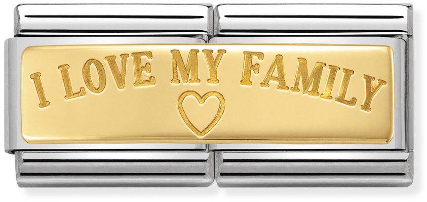 Nomination classic double 030710-03 I love my family. Nomination palat ovat valmistettu laadukkaasta ruostumattomasta teräksestä ja 18k kullasta. Nomination paloille myönnetään kahden vuoden takuu!