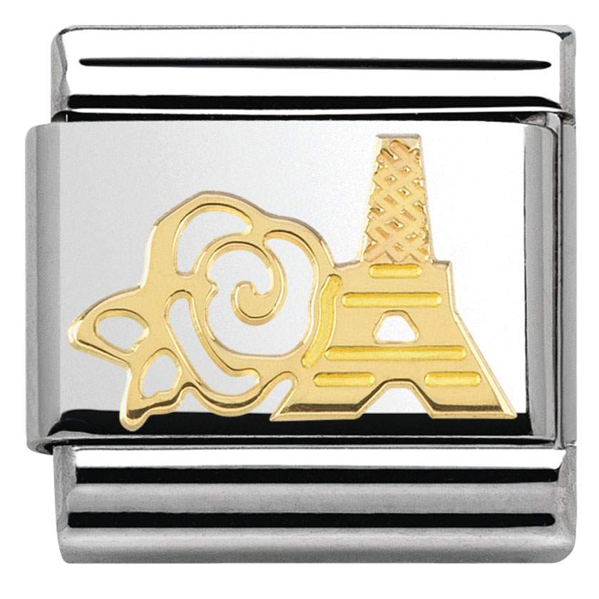 Nomination Classic Rose and Eiffel Tower 030162-18. Nomination palat ovat valmistettu laadukkaasta ruostumattomasta teräksestä ja 18k kullasta. Nomination paloille myönnetään kahden vuoden takuu ja ne toimitetaan valmistajan alkuperäisessä rasiassa!