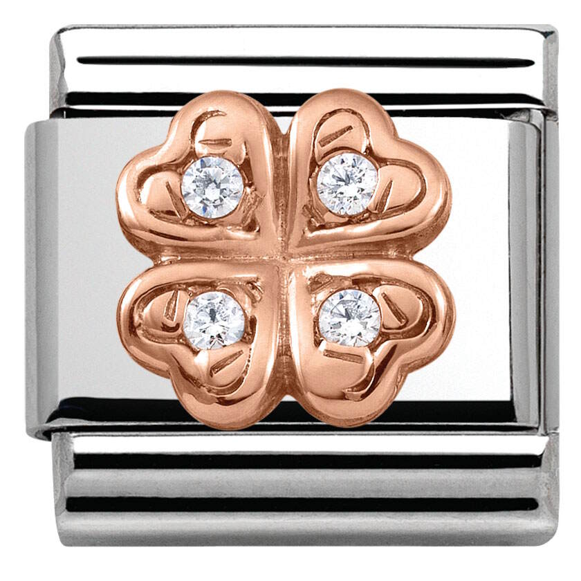 Nomination Classic Rose Gold 430302-04 Four-Leaf Clover. Nomination RoseGold palat on valmistettu laadukkaasta ruostumattomasta teräksestä ja 9 karaatin punakullasta. Palaa koristavat säihkyvät zirkonia-korukivet. Nomination paloille myönnetään kahden vuoden takuu!
