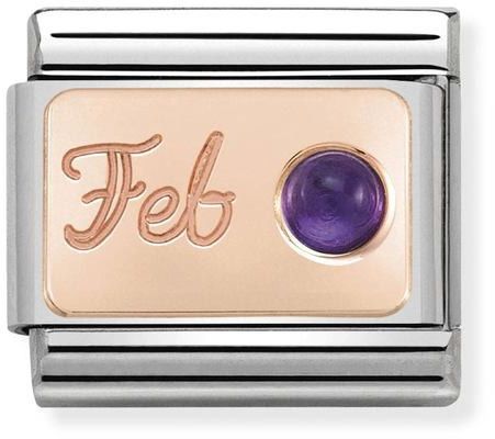 Nomination Classic RoseGold 430508-02 February. Nomination palat ovat valmistettu laadukkaasta ruostumattomasta teräksestä ja 9k punakullasta. Palaa koristaa violetti ametisti. Nomination paloille myönnetään kahden vuoden takuu!