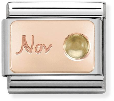Nomination Classic RoseGold 430508-11 November. Nomination palat ovat valmistettu laadukkaasta ruostumattomasta teräksestä ja 9k punakullasta. Palaan on istutettu vihertävä citriini. Nomination paloille myönnetään kahden vuoden takuu!