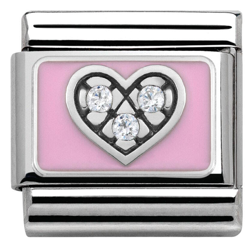 Nomination Classic SilverShine 330306-06 CZ Heart with pink. Nomination SilverShine palat on valmistettu laadukkaasta ruostumattomasta teräksestä ja 925-Sterling hopeasta. Palaan on istutettu säihkyviä zirkoneja. Vaaleanpunainen tausta on emalia. Nomination paloille myönnetään kahden vuoden takuu!