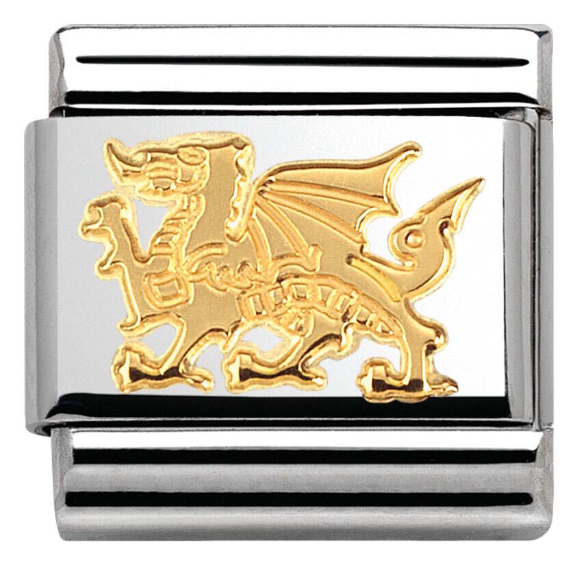 Nomination Classic Walesin lohikäärme 030112-31. Oivallinen muisto Walesissa matkustaneelle tai muuten lohikäärmeistä kiinnostuneelle. Nomination palat ovat valmistettu laadukkaasta ruostumattomasta teräksestä ja 18k kullasta. Nomination paloille myönnetään kahden vuoden takuu ja ne toimitetaan valmistajan alkuperäisessä rasiassa!