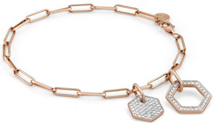 Nomination Emozioni 147801/001 on kaunis ja siro punakullanvärinen rannekoru. Sormus on valmistettu sterling-hopeasta ja päällystetty 22K ruusukullalla. Kokonaisuuden viimeistelee kaksi kuusikulmaista riipusta, jotka on koristeltu säkenöivin zirkonioin. Korun pituus on 19 cm, joskin se on säädettävissä myös pienemmäksi. Helojen halkaisijat ovat 1,2 ja 1,5 cm.