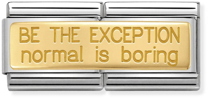 Ole rohkeasti oma itsesi! Nomination Gold -malliston motivoivat lausahdukset tuovat puhtia päivään. Be The Exception normal is boring 030710-23 -korupala on valmistettu ruostumattomasta teräksestä ja 18 kt kullasta.