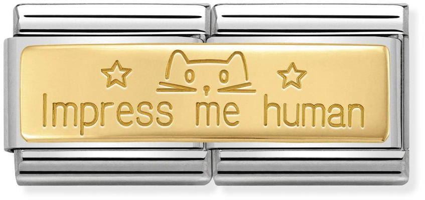 Eläinaiheiset Nomination Gold -palat ovat ihana lahjaidea lemmikinomistajille ja muille kaikenkarvaisista otuksista pitäville. Tuplakoossa tuleva Impress me human 030710-20 -malli on syntynyt ruostumattomasta teräksestä ja 18 kt kullasta.