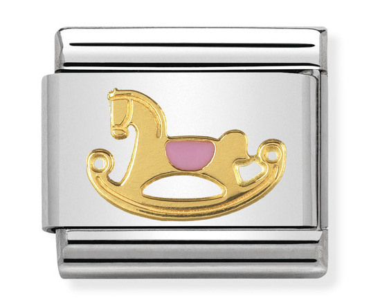 Nomination Gold Pink Rocking Horse 030242-43 -korupala on valmistettu hopeanvärisestä ruostumattomasta teräksestä ja sen symboli on 18k kultaa. Symbolin kaiverruksessa on koristeena vaaleanpunaista emalia. Nomination -korupaloille myönnetään kahden vuoden takuu ja ne toimitetaan valmistajan alkuperäisessä pakkauksessa!