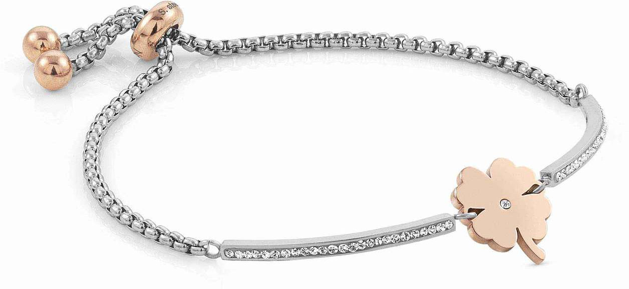Nomination Milleluci four-leaf clover rannekoru 028004/006. Korussa on todella kätevä liukuva lukko, joka takaa täydellisen istuvuuden ranteeseen. Pituus on säädettäissä liukvasti välillä 14-19 cm. Rannekoru on valmistettu ruostumattomasta teräksestä ja siihen on istutettu kirkkaita zirconia korukiviä. Punakullan väriset osat ovat PVD pinnoitettua ruostumatonta terästä. Apilan halkaisija on 12 mm. Italialaiset Nomination-korut toimitetaan valmistajan alkuperäisessä pakkauksessa.