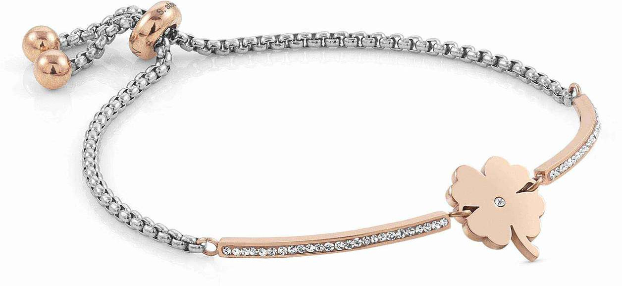 Nomination Milleluci four-leaf clover rannekoru 028005/006. Korussa on todella kätevä liukuva lukko, joka takaa täydellisen istuvuuden ranteeseen. Pituus on säädettäissä liukvasti välillä 14-19 cm. Rannekoru on valmistettu ruostumattomasta teräksestä ja siihen on istutettu kirkkaita zirconia korukiviä. Punakullan väriset osat ovat PVD pinnoitettua ruostumatonta terästä. Apilan halkaisija on 12 mm. Italialaiset Nomination-korut toimitetaan valmistajan alkuperäisessä pakkauksessa.