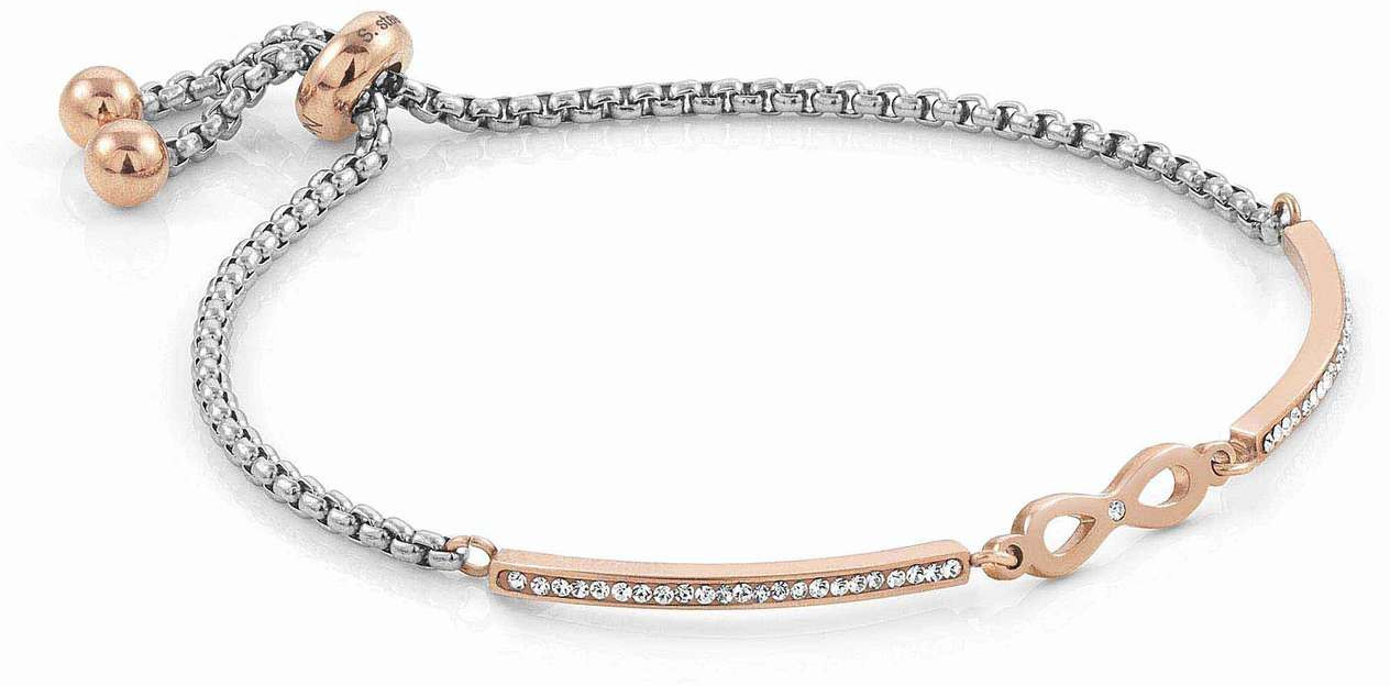 Nomination Milleluci Infinity rannekoru 028005/024. Korussa on todella kätevä liukuva lukko, joka takaa täydellisen istuvuuden ranteeseen. Pituus on säädettäissä liukvasti välillä 14-19 cm. Rannekoru on valmistettu ruostumattomasta teräksestä ja siihen on istutettu kirkkaita zirconia korukiviä. Punakullan väriset osat ovat PVD pinnoitettua ruostumatonta terästä. Äärettömyys merkin leveys on 13 mm. Italialaiset Nomination-korut toimitetaan valmistajan alkuperäisessä pakkauksessa.