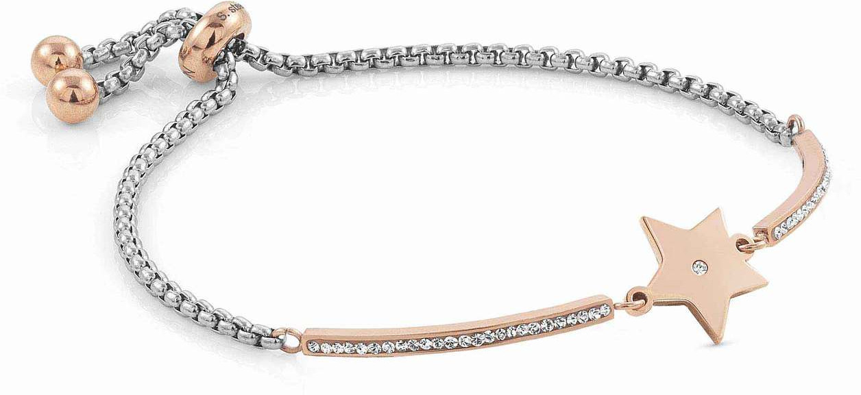 Nomination Milleluci Star rannekoru 028005/023. Korussa on todella kätevä liukuva lukko, joka takaa täydellisen istuvuuden ranteeseen. Pituus on säädettäissä liukvasti välillä 14-19 cm. Rannekoru on valmistettu ruostumattomasta teräksestä ja siihen on istutettu kirkkaita zirconia korukiviä. Punakullan väriset osat ovat PVD pinnoitettua ruostumatonta terästä. Tähden halkaisija on 12 mm. Italialaiset Nomination-korut toimitetaan valmistajan alkuperäisessä pakkauksessa.