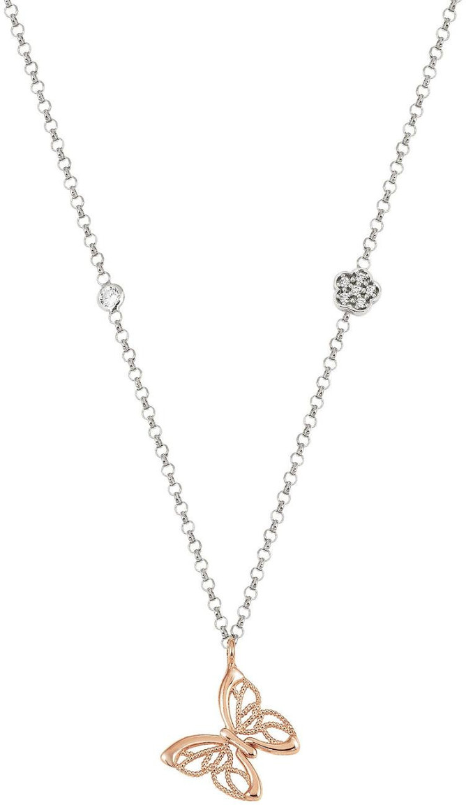 Liihota kuin perhonen - vielä vuosienkin päästä! Nomination Primavera 147404-019 -kaulakoru on valmistettu rodinoidusta sterling-hopeasta eikä se näin ollen tummu ajan kuluessa lähes lainkaan. 15x15 mm perhosriipus on pinnoitettu 22 kt punakullalla ja sen yläpuolella säteilevät myös kaksi kirkkain zirkonioin koristeltua yksityiskohtaa. Ketju on säädettävissä 40-44 cm pituuteen. Toimitus valmistajan alkuperäisessä pakkauksessa.