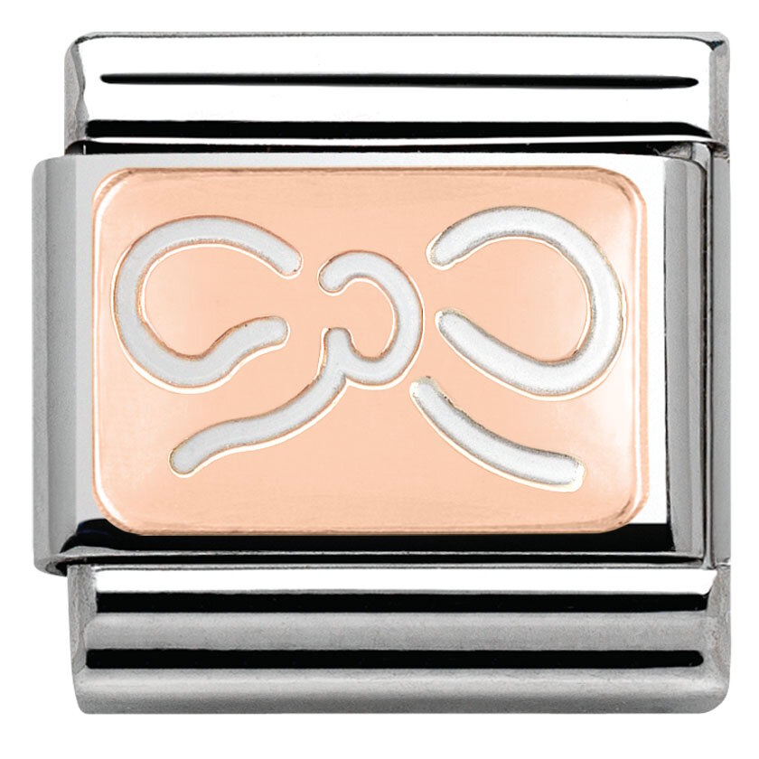 Nomination Rose Gold 430101 12 palassa on rusetin kuva. Tämä pala kuuluu Nominationin punakulta kokoelmaan ja se on valmistettu ruostumattomasta teräksestä ja 9 karaatin punakullasta. Nomination paloille myönnetään kahden vuoden takuu.