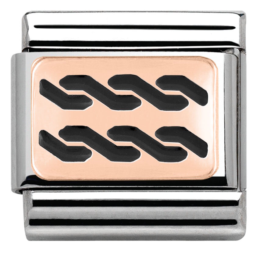 Nomination Rose Gold 430201 02 palassa on mustasta emalista tehty kuvio punakultaisella pohjalla. Tämä pala kuuluu Nominationin punakulta kokoelmaan ja se on valmistettu ruostumattomasta teräksestä ja 9 karaatin punakullasta. Nomination paloille myönnetään kahden vuoden takuu.