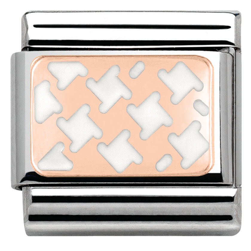 Nomination Rose Gold 430201 04 palassa on valkoisesta emalista tehty kuvio punakultaisella pohjalla. Tämä pala kuuluu Nominationin punakulta kokoelmaan ja se on valmistettu ruostumattomasta teräksestä ja 9 karaatin punakullasta. Nomination paloille myönnetään kahden vuoden takuu.