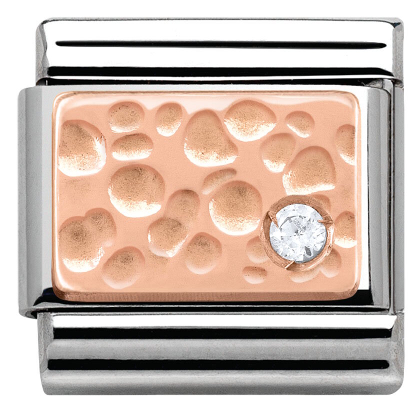 Nomination Rose Gold 430303 02 palassa on taotun punakultalaatan kulmassa kirkas zirnconia. Tämä pala kuuluu Nominationin punakulta kokoelmaan ja se on valmistettu ruostumattomasta teräksestä ja 9 karaatin punakullasta. Nomination paloille myönnetään kahden vuoden takuu.