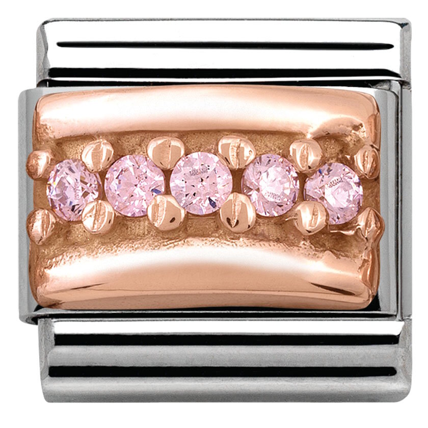 Nomination Rose Gold 430304 06 palassa on rivi vaaleanpunaisia zirconioita. Tämä pala kuuluu Nominationin punakulta kokoelmaan ja se on valmistettu ruostumattomasta teräksestä ja 9 karaatin punakullasta. Nomination paloille myönnetään kahden vuoden takuu.