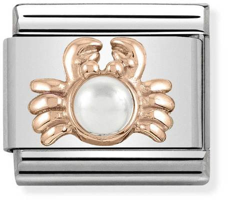 Nomination Rose Gold Crab with White Pearl 430511-01 -helassa on aiheena taskurapu. Palan runko on valmistettu ruostumattomasta teräksestä ja ruusukullan värinen osa on 9 karaatin ruuskultaa. Ravun kotilo on valkoinen helmi. Nomination-paloille myönnetään kahden vuoden takuu.