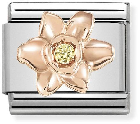Luontoaiheiset Nomination Rose Gold -palat tuovat keräilykoruusi raikkautta ja kesäistä kepeyttä. Daffodil with Yellow CZ 430305-13 -mallissa kukkii ihastuttava narsissi. Tämä hurmaava korupala on loihdittu ruostumattomasta teräksestä, 9 kt punakullasta ja keltaisesta zirkoniakivestä.