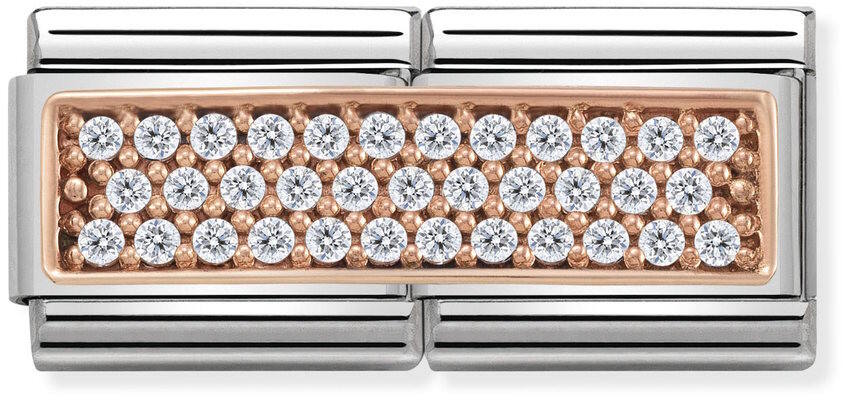 Nomination Rose Gold double 430731-01 Rose zircon. Nomination palat ovat valmistettu laadukkaasta ruostumattomasta teräksestä ja 9k punakullasta. Palaan on istutettu kirkkaita zirkoneja tuomaan säihkettä. Nomination paloille myönnetään kahden vuoden takuu!