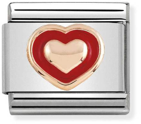 Nomination Rose gold Heart with red border 430203-01-korupalaa koristaa 9 karaatin ruusukullasta valmistettu sydän, joka on koristeltu emalimaalilla. Pala on valmistettu ruostumattomasta teräksestä. Nomination-paloille myönnetään kahden vuoden takuu.